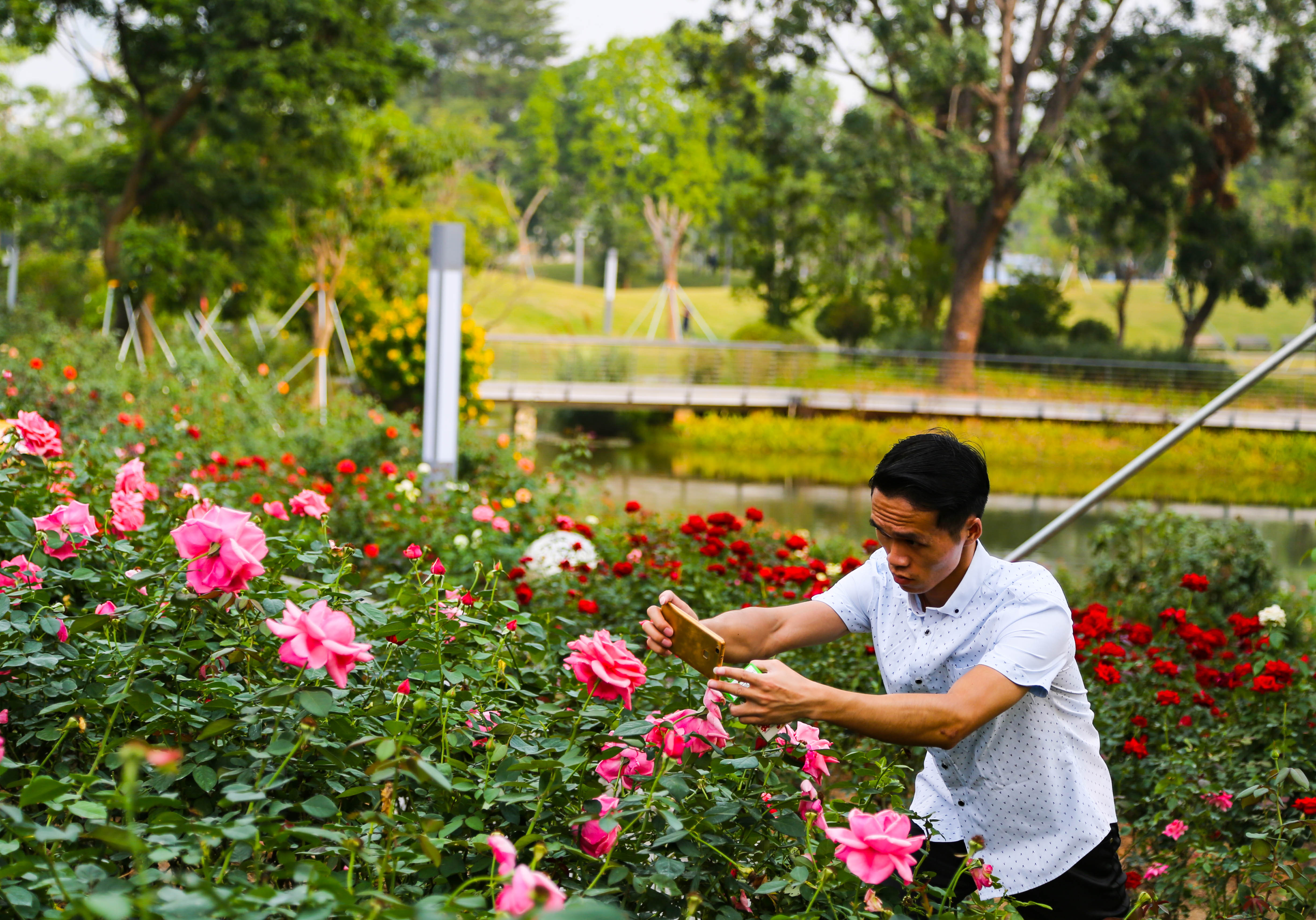在婚姻登記處和禮堂的北側是一大片的玫瑰花海,最近天氣晴好,正是鮮花怒放的時候,不少市民在在參觀完裝修中的禮堂之后,選擇在花海里自拍,一位市民甚至把落下的花瓣拾起,裝了滿滿兩袋,用花瓣在地上擺成“智慧”等漢字字樣。