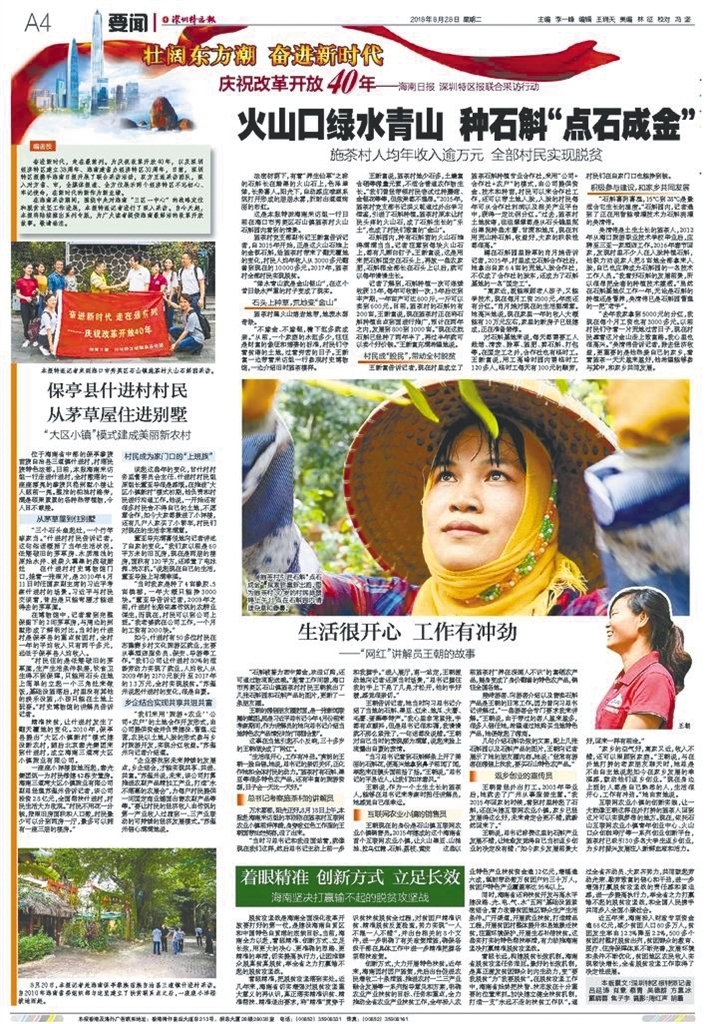 8月28日,《深圳特區(qū)報(bào)》推出了“壯闊東方潮奮進(jìn)新時(shí)代”慶祝改革開放40年——《海南日?qǐng)?bào)》《深圳特區(qū)報(bào)》聯(lián)合采訪行動(dòng)首期報(bào)道。首期報(bào)道通過通訊、評(píng)論等形式,以點(diǎn)帶面,展示了海南全力打贏脫貧攻堅(jiān)戰(zhàn)取得的成就。