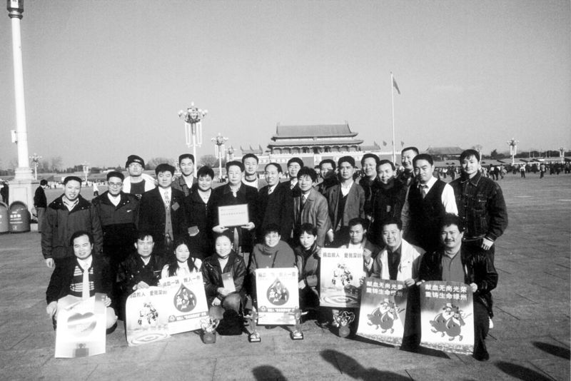 1999年,27位深圳市民獲得全國(guó)首批無(wú)償獻(xiàn)血金質(zhì)獎(jiǎng)杯后在天安門(mén)前合影。余海蓉 攝