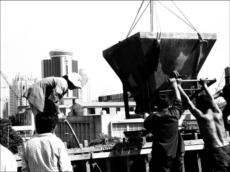 1985年,建設(shè)者們在深圳火車站人行天橋施工。 呂翔 攝
