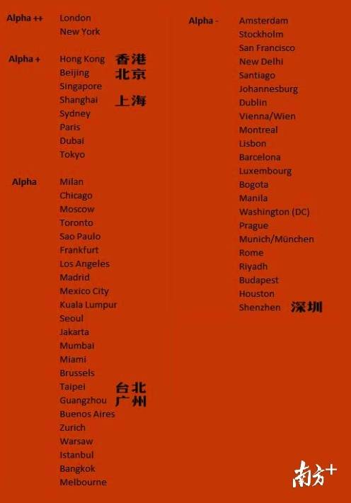 其它的中國(guó)城市,香港、北京、上海位于第二檔Alpha+級(jí),分別位于全球3、4、6位,該級(jí)共有8個(gè)城市;臺(tái)北、廣州位于第三檔Alpha級(jí),分別位于全球26、27位,該級(jí)共有23個(gè)城市。