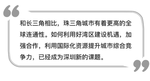 一方面,深圳要開展更大范圍、更高水平、更深層次的全球合作,提升在全球網(wǎng)絡中的地位和能級,增強對經(jīng)濟資源要素的配置能力,加深與全球市場的融合程度。另一方面,深圳也應從本土優(yōu)勢和特色出發(fā),進一步融入國家開放格局,構(gòu)筑良性的城市-腹地關(guān)系,培育內(nèi)生的經(jīng)濟、產(chǎn)業(yè)、設施、資源等支撐體系,通過區(qū)域協(xié)同發(fā)展,增強全球競爭力。