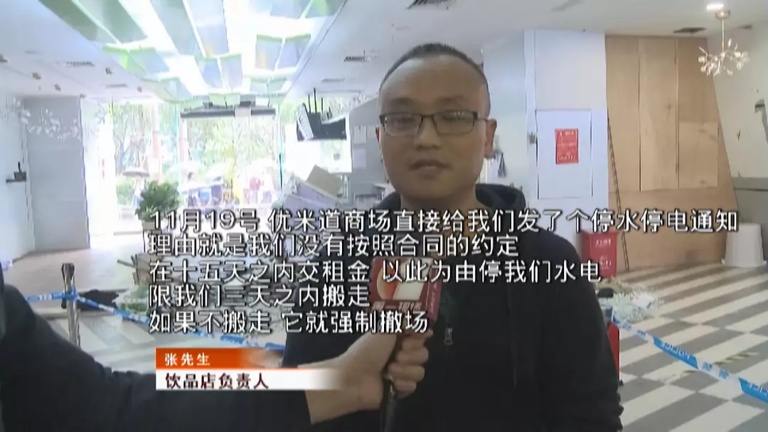 記者在飲品店墻上看到了一則通知,優(yōu)米道商場(chǎng)以飲品店拖欠租金為由與其解約,限飲品店在11月23日15點(diǎn)前自行離場(chǎng),到期不按時(shí)騰空鋪位,飲品店將要承擔(dān)由此產(chǎn)生的一切損失和后果。