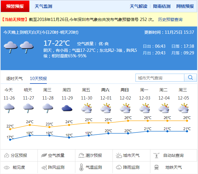 記者從深圳市氣象臺了解到今天陰天,間中有小雨,氣溫17℃-22℃;周二到周四以陰天為主,間中有分散小雨;周五到周日多云,可見陽光,氣溫回升。