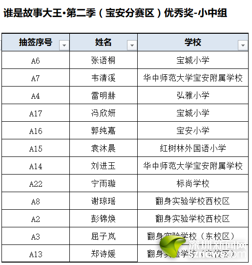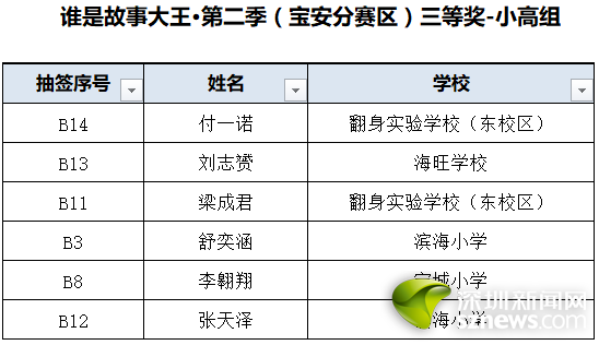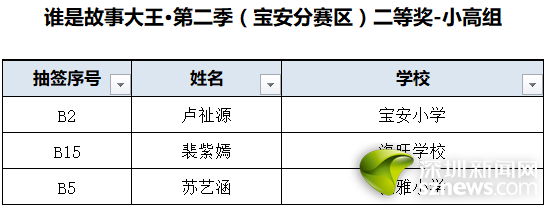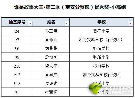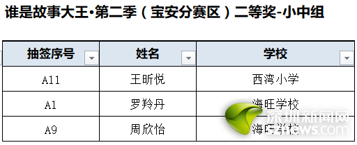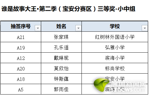 誰是故事大王·第二季(寶安分賽區(qū))獲獎名單: