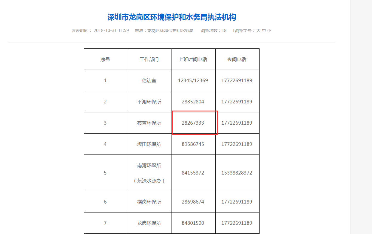 深圳市龍崗區(qū)環(huán)境保護和水務局官網(wǎng)掛出的布吉環(huán)保所電話