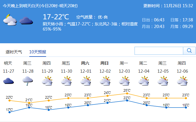 市氣象局發(fā)布未來十天天氣預報(數(shù)據(jù)更新于11月26日15時32分)