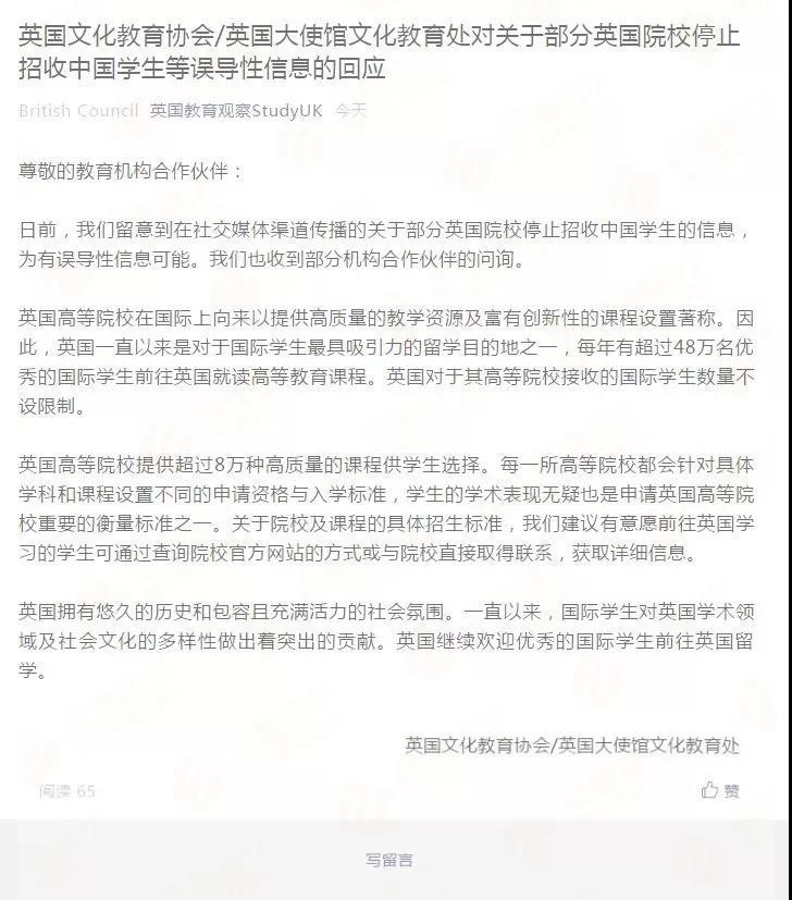 記者發(fā)現(xiàn),英國(guó)文化教育協(xié)會(huì)/英國(guó)大使館文化教育處對(duì)關(guān)于部分英國(guó)院校停止招收中國(guó)學(xué)生這一信息已做出官方回應(yīng):他們留意到在社交媒體渠道傳播的關(guān)于部分英國(guó)院校停止招收中國(guó)學(xué)生的信息,為有誤導(dǎo)性信息可能。