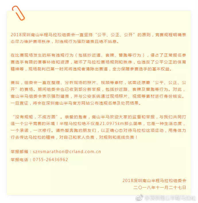 https://mp.weixin.qq.com/s/xge5TY29hk9IjLRMCAG43w希望廣大跑者遵守賽事規(guī)程,尊重其他正常參賽的跑者,尊重體育精神,自覺維護賽場秩序;深圳南山半程馬拉松組委會將在今后賽事中加強賽事監(jiān)督管理并融入技術(shù)手段,以跑者體驗至上,共同營造健康、公正、公平的馬拉松參賽環(huán)境。