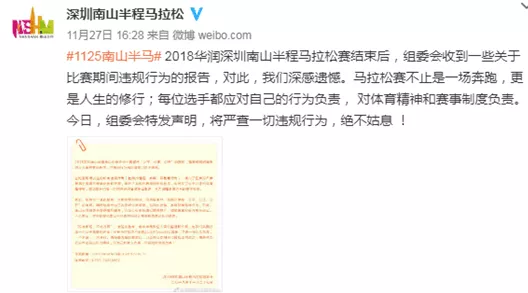 27日,南山半馬賽事組委會通過微博發(fā)布聲明稱,在比賽現(xiàn)場發(fā)生的所有違規(guī)行為,侵占了正常報名參賽選手有限的賽事補給和資源,破壞了馬拉松賽場規(guī)則和秩序,也違反了公平公正的體育精神等,現(xiàn)場裁判已第一時間將違規(guī)者清除出賽道,全力保障參賽選手的基本權(quán)益。