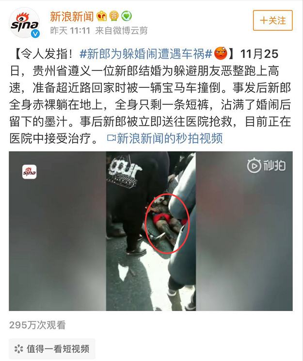 事發(fā)后,新郎全身赤裸,只剩一條短褲,沾滿(mǎn)了婚鬧后留下的墨汁。