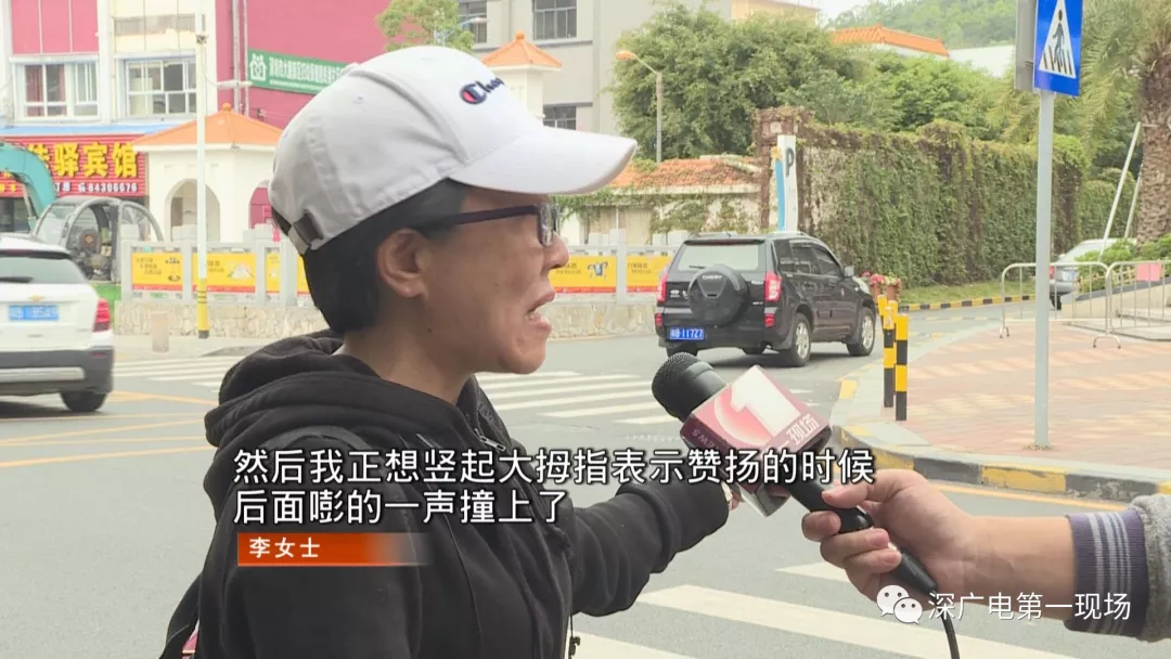 正當;李女士要贊揚他時,這輛小汽車被后面的電動車追尾了