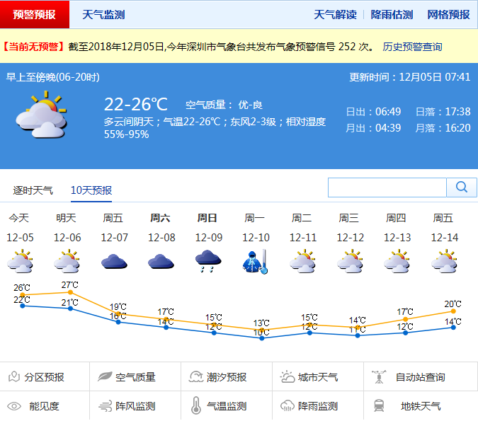記者從深圳氣象局獲悉,5-6日陰天間多云,早晚有輕霧,間中有零星小雨,5日氣溫20-26℃;7-8日陰天有分散小雨,北風(fēng)加大,氣溫下降,天氣轉(zhuǎn)涼;9-11日有中雨局部可達大雨,氣溫進一步下降,最低氣溫降至10℃左右,天氣陰冷。