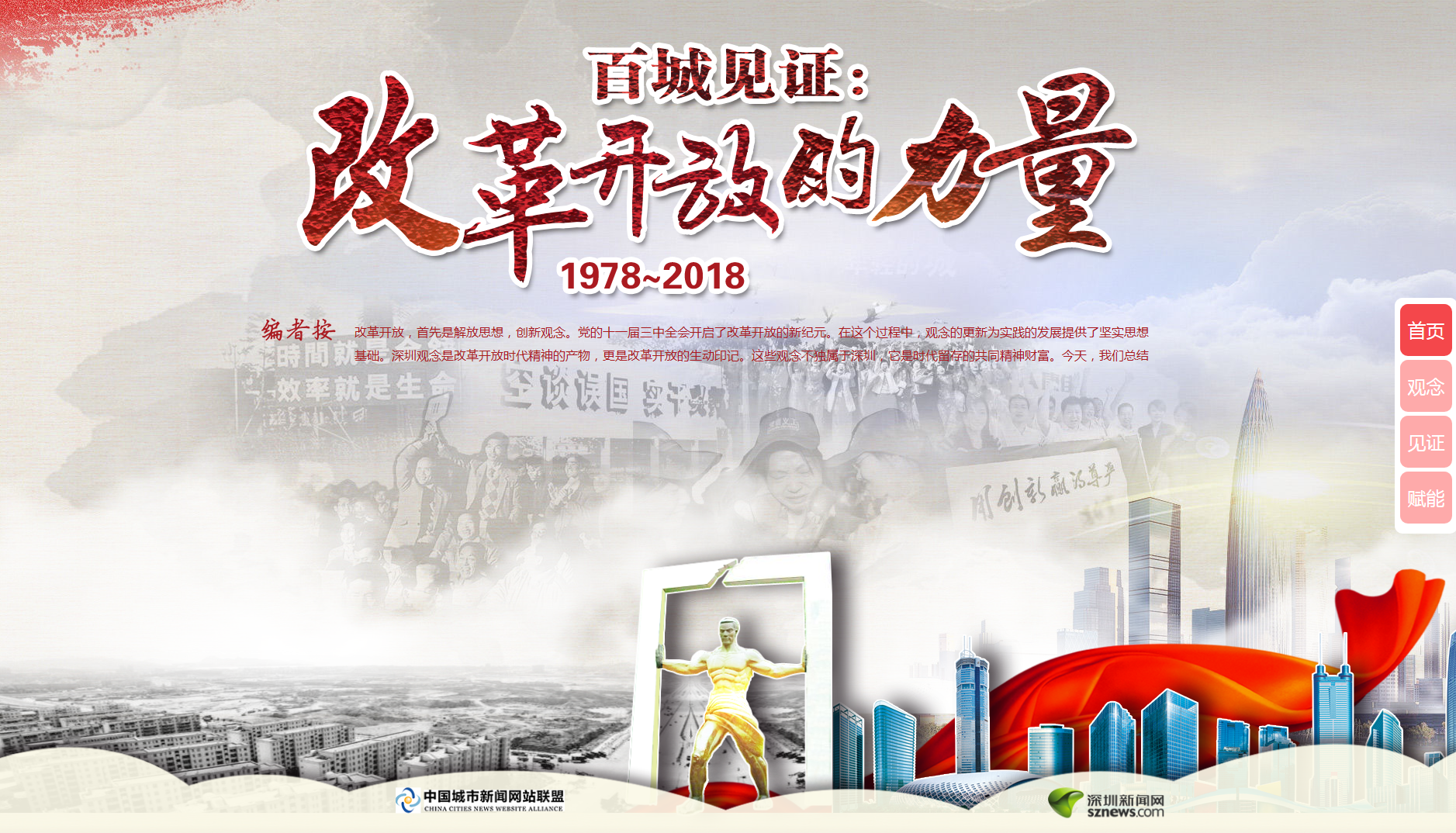 此次活動由中國城市新聞網(wǎng)站聯(lián)盟主辦,深圳新聞網(wǎng)承辦,活動在今年10月中國城市新聞網(wǎng)站聯(lián)盟總編輯聯(lián)席會上正式啟動。專題網(wǎng)頁采用全新H5技術(shù),用歷史原圖、視頻、音頻和文字交互呈現(xiàn)方式,詮釋改革、實干、擔(dān)當(dāng)、文明、開放、創(chuàng)新等深入民心的改革開放觀念,并發(fā)動網(wǎng)盟近百家成員單位網(wǎng)站,深入挖掘當(dāng)?shù)爻鞘懈母镩_放的生動案例和故事,報道這些代表性觀念對所在城市發(fā)展的巨大影響,共同描繪改革開放40年的生動畫卷。