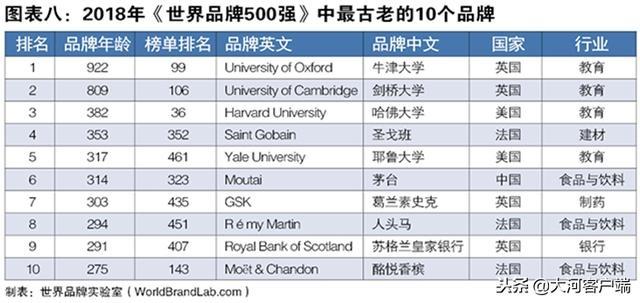 2018年度《世界品牌500強(qiáng)》的平均年齡達(dá)到100.14歲,相比去年的100.19歲略有下降。其中100歲及以上的“百年老牌”多達(dá)213個(gè),美國以92個(gè)占比達(dá)到4成。英國的兩所知名學(xué)府牛津、劍橋分別列為最古老品牌的前兩名。學(xué)校的歷史積淀是知識的沉淀感的最佳表象。除去擁有悠久歷史的著名大學(xué)之外,法國的老牌公司圣戈班Saint Gobain(353歲)是企業(yè)界擁有最長歷史的品牌。中國入選的38個(gè)品牌中只有茅臺、青島啤酒、五糧液、中國銀行超越百齡。依行業(yè)來看,食品與飲料類品牌最古老,100歲以上的入選品牌占到了27個(gè)。