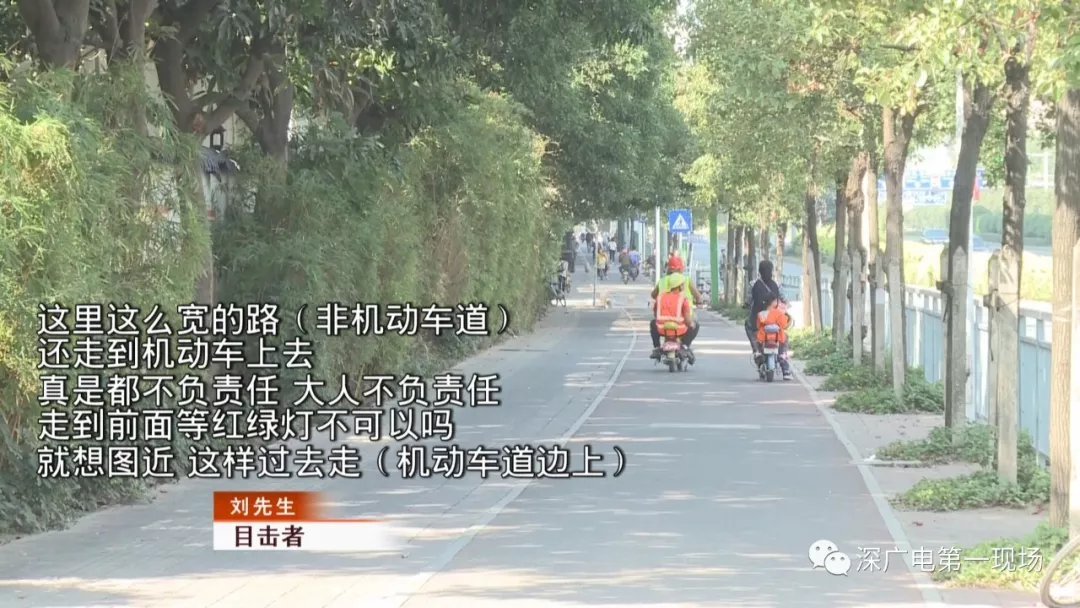 今天上午記者來到了事發(fā)現(xiàn)場,寶安大道和新安六路的交匯口。在現(xiàn)場,電動(dòng)車違規(guī)現(xiàn)象嚴(yán)重:走機(jī)動(dòng)車道、不戴頭盔、違規(guī)載人、不等紅燈的現(xiàn)象比比皆是,甚至出現(xiàn)了逆行的情況。雖然設(shè)置了非機(jī)動(dòng)車道,但使用者寥寥無幾。