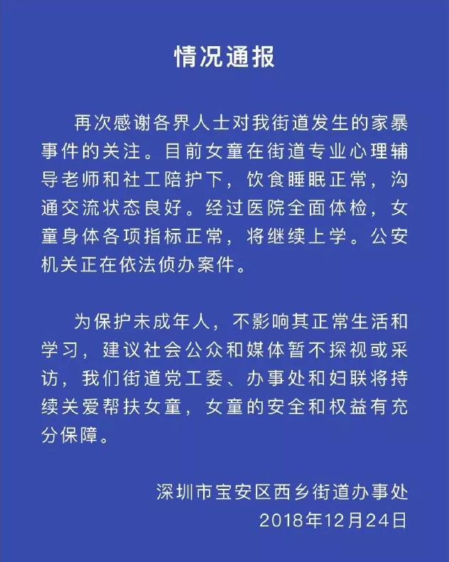 12月23日,深圳警方關注并調查此事。隨后深圳市寶安區(qū)委宣傳部官方微博@陽光寶安發(fā)布通報稱,女童父母對毆打女童的事實供認不諱。寶安區(qū)婦聯(lián)已向法院申請女童人身安全保護令。