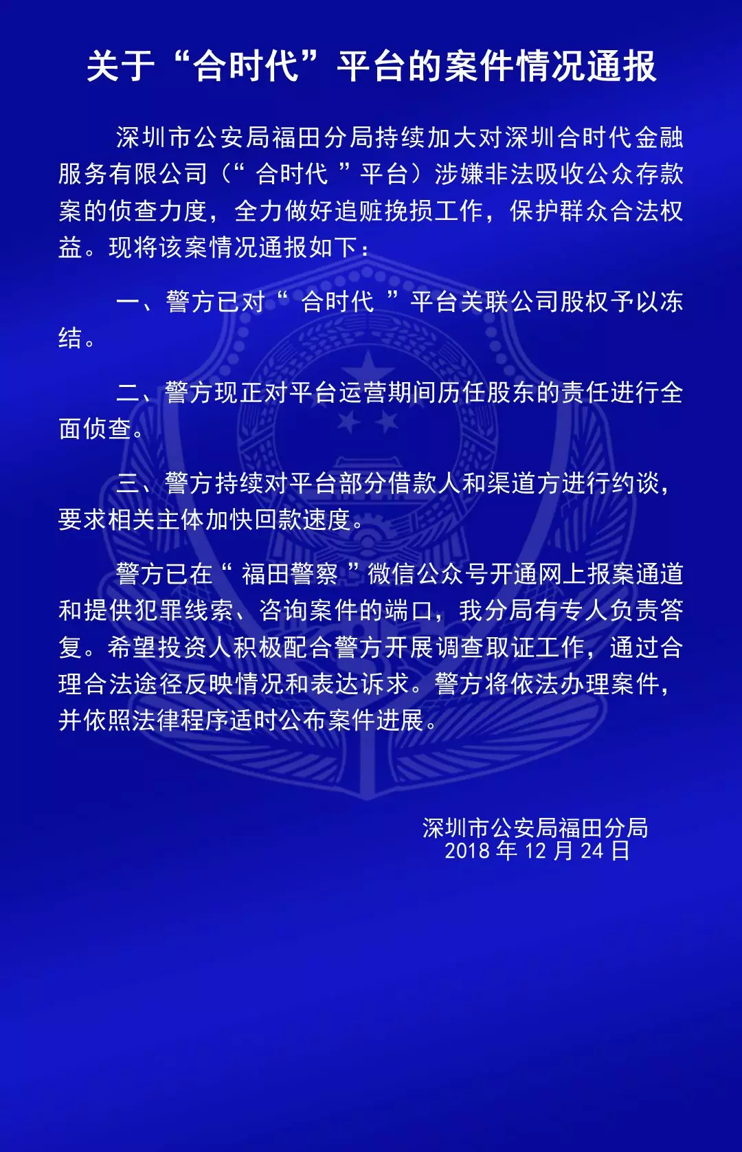 關(guān)于“合拍在線”“壹佰金融”“五星財(cái)富”“眾車(chē)在線”“財(cái)富中國(guó)”“小零錢(qián)”“錢(qián)爸爸”“合時(shí)代”和“前金融”平臺(tái)的案情通報(bào)