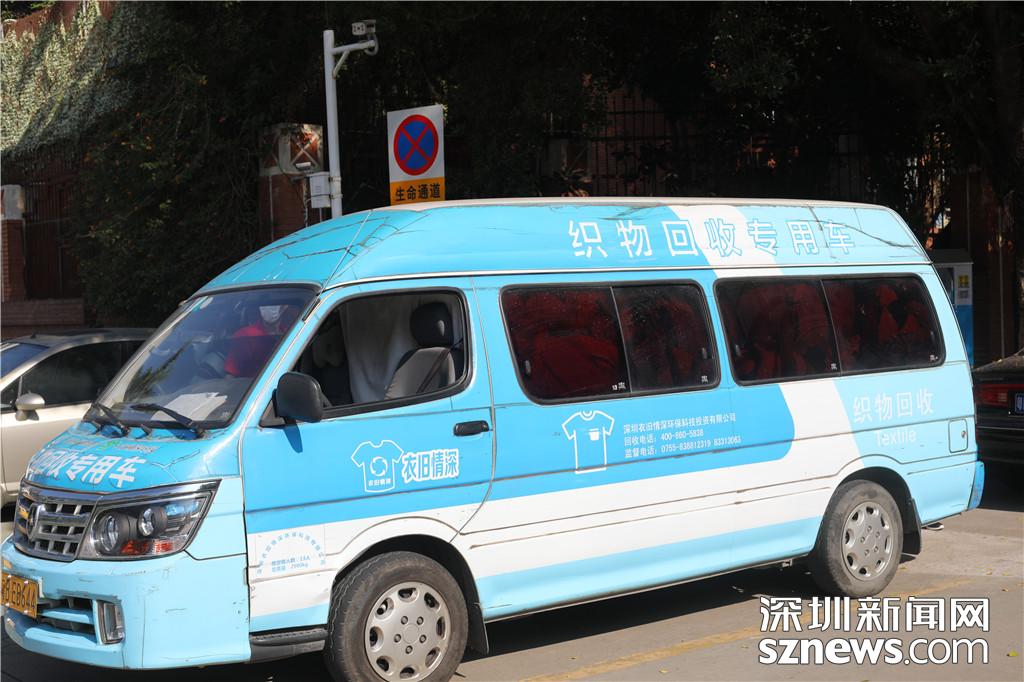 在福田區(qū)梅林一村的近停車場入口處,記者在幾乎要滿的織物回收箱前等待著該公司運輸車輛的到來。不久后,一輛噴涂有織物回收專用車字樣的面包車進入了停車場。據介紹,該車輛噴涂為政府統一要求,進行廢舊織物回收的作業(yè)的車輛需要有統一的涂裝。