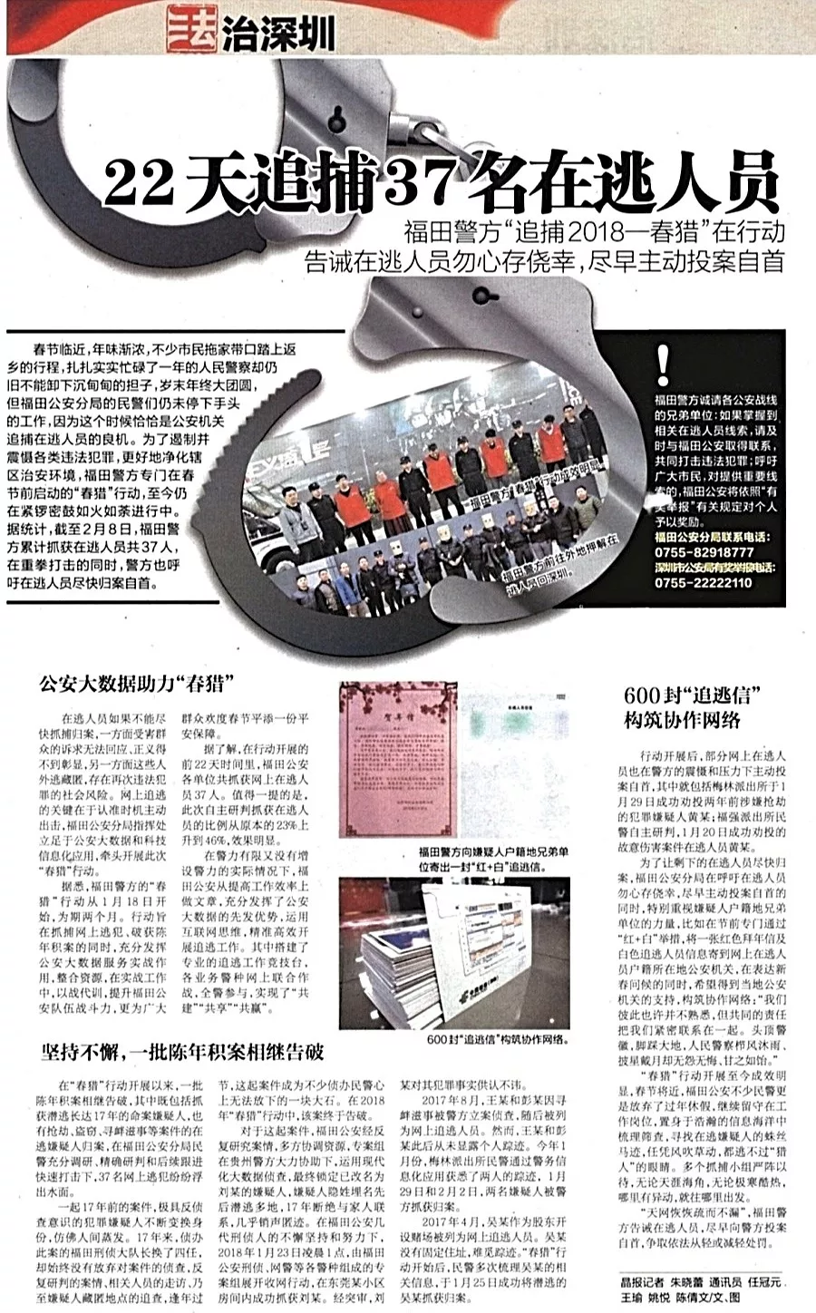 ★★春節(jié)臨近,萬(wàn)家團(tuán)圓,福田公安分局的民警卻更忙了。他們?yōu)榱硕糁普饝馗黝愡`法犯罪,凈化轄區(qū)治安環(huán)境,專門在春節(jié)前啟動(dòng)“春獵”行動(dòng),劍指負(fù)案在逃的犯罪嫌疑人,行動(dòng)截止2月8日,警方累計(jì)抓獲在逃人員37人。