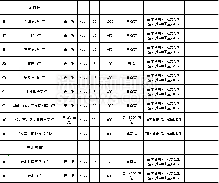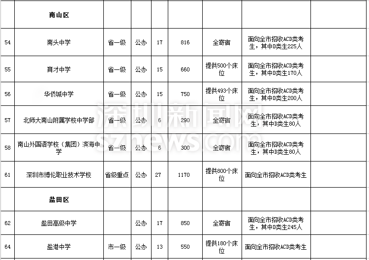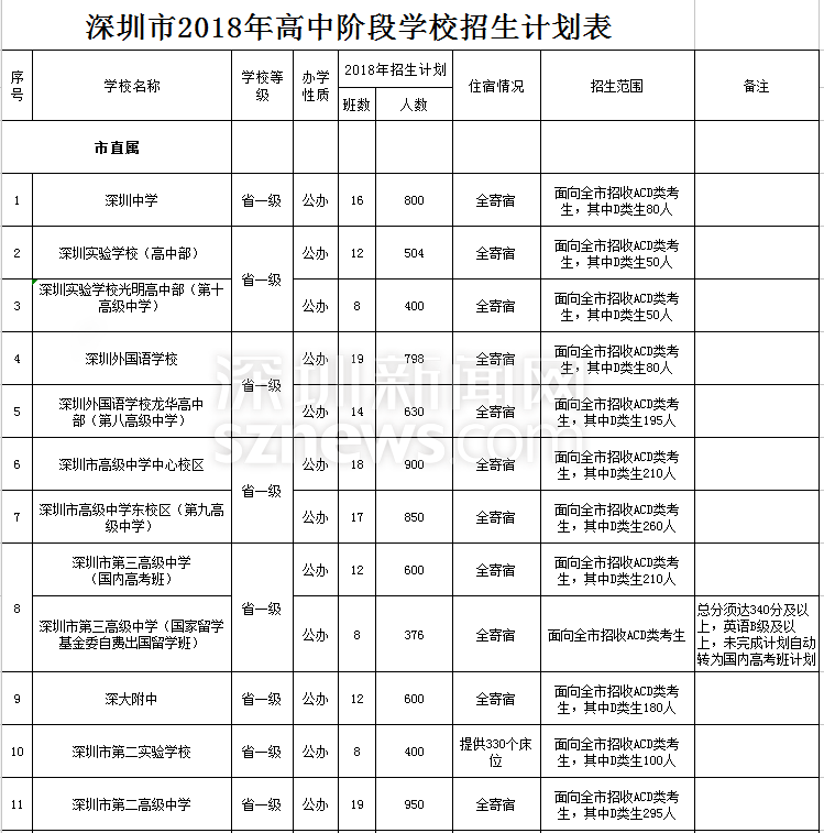 記者查閱了深圳市教育局2018年發(fā)布的高中階段學校招生計劃表。除去民辦學校,深圳共有71所公辦高中階段學校(含普高、職高)參與招生,其中普高占50所,提供34379個學位。