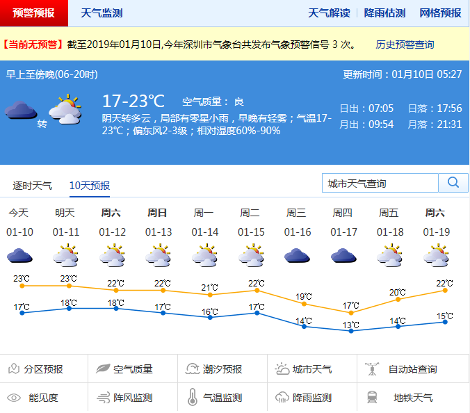 綜合海氣環(huán)流分析和歷史氣候背景,市氣象局預計深圳的1月將是“氣溫起伏大、階段性陰冷、降雨少而弱”的特點。分別在15-17日、24-25日、1月底至2月初會有冷空氣影響,伴小雨或分散小雨,沿海和高地陣風7-8級,且月內最低氣溫10℃以下會有三天左右。而在冷空氣間歇期,則受暖濕南風影響,空氣濕度加大,易出現(xiàn)霧和輕微回南天。未來幾日多云間陰天,陽光增多,早晚有輕霧,天氣溫暖,早晚較濕潤;15日起冷空氣影響,氣溫小幅下降。