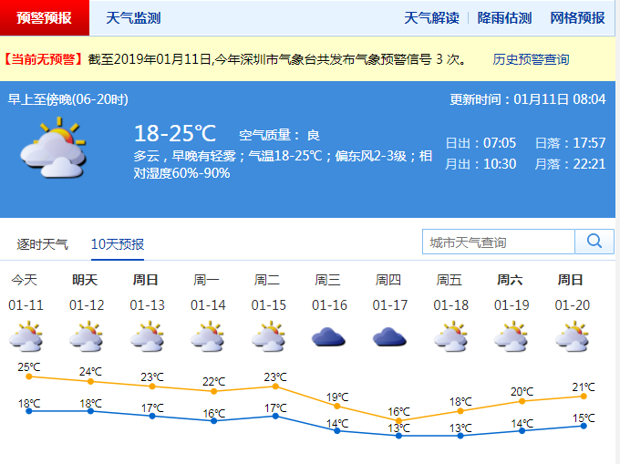 記者從深圳市氣象局了解到,11日陰天,早晚有輕霧,氣溫17-22℃;12-15日多云間陰天,早晚能見度低,可見陽光,天氣平穩(wěn),氣溫小幅波動;15日夜間起受新一輪冷空氣影響,陰天伴有分散小雨,北風(fēng)加大,氣溫下降。