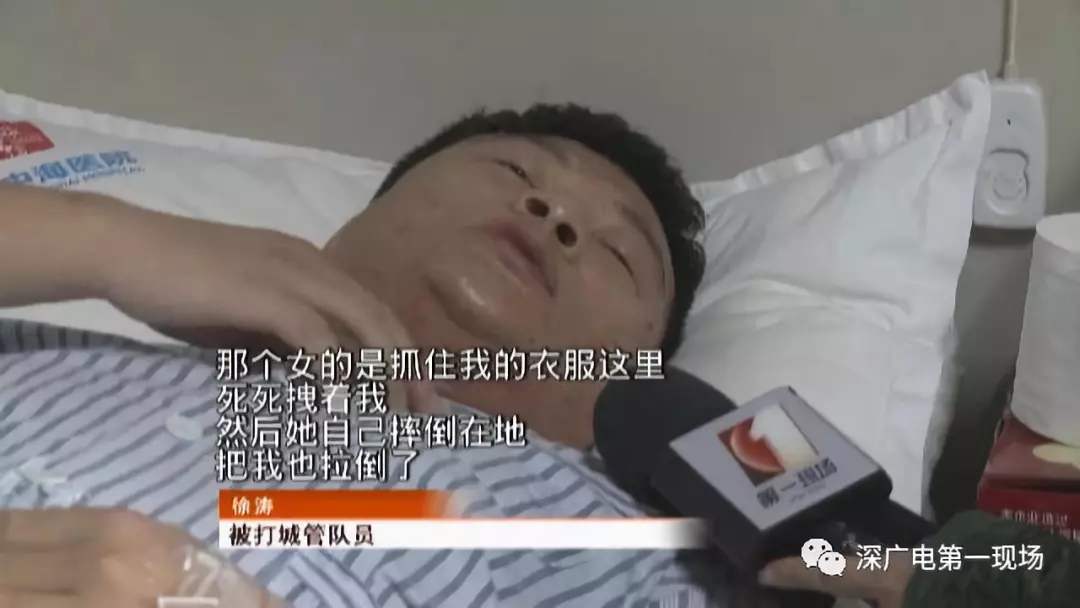 被打城管隊員徐濤:“她就一直罵,我站在那里,她吐口水直接吐在我臉上,然后我去手擋口水的時候,他兩公婆直接就上來打我?!?/p> 小商販惹眾怒