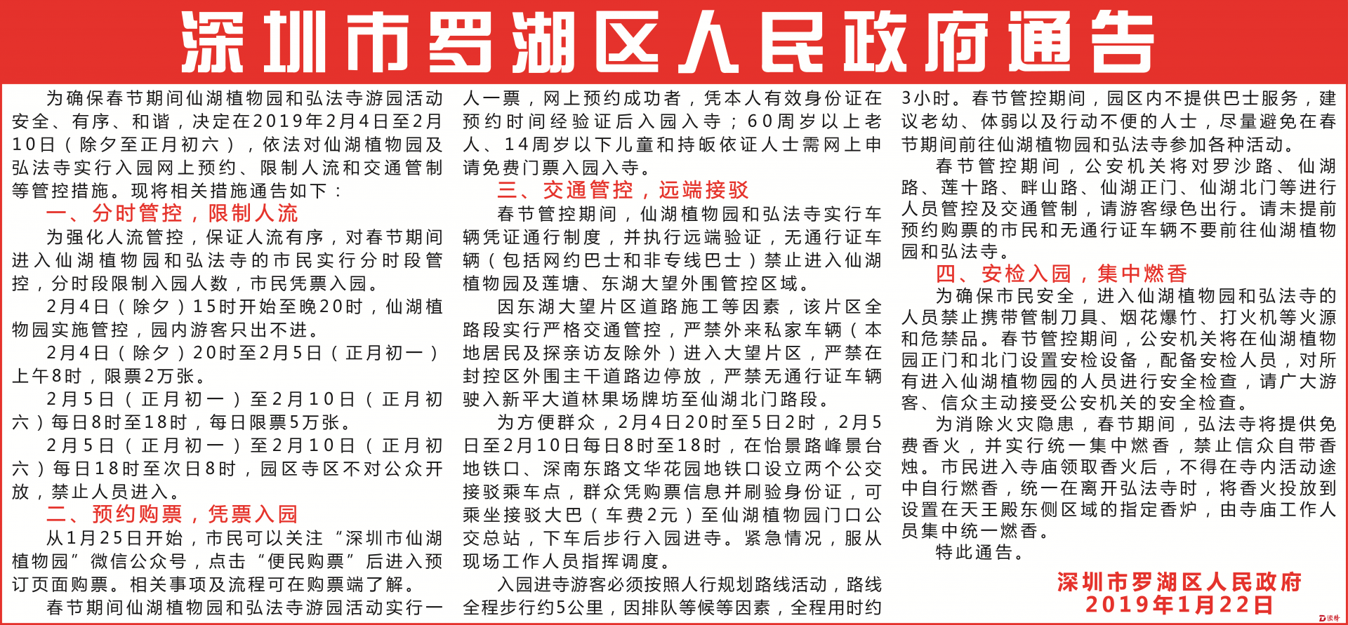 為確保春節(jié)期間仙湖植物園和弘法寺游園活動(dòng)安全、有序、和諧,決定在2019年2月4日至2月10日(除夕至正月初六),依法對(duì)仙湖植物園及弘法寺實(shí)行入園網(wǎng)上預(yù)約、限制人流和交通管制等管控措施。現(xiàn)將相關(guān)措施通告如下: