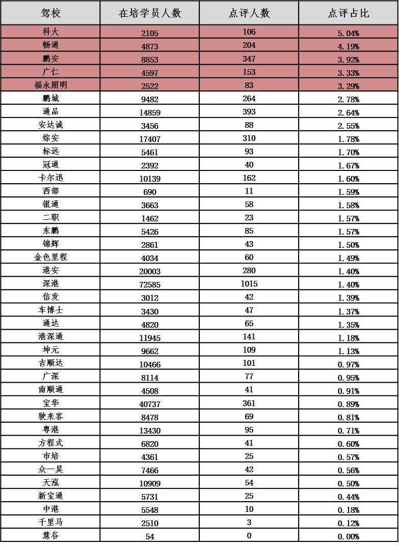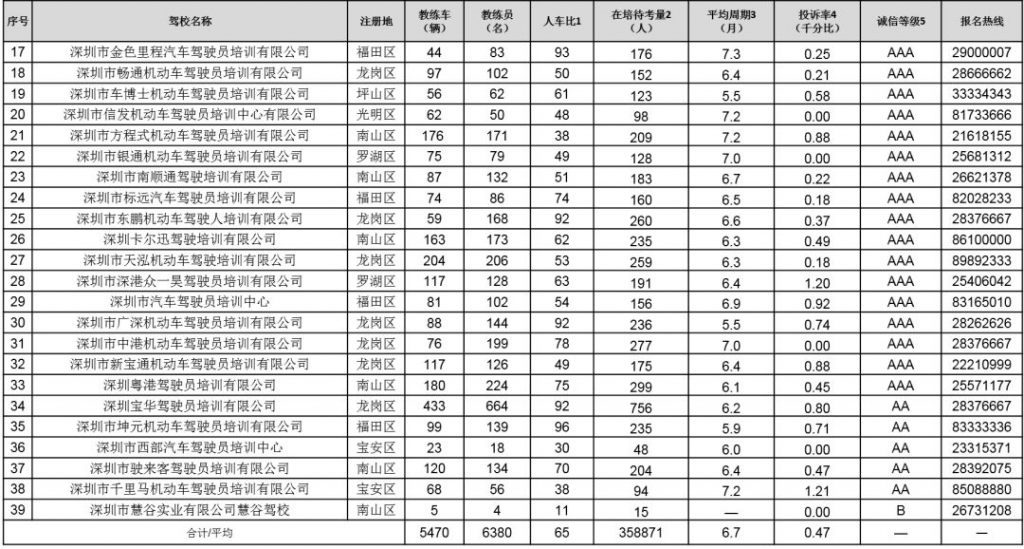 以下對深圳各駕校詳細(xì)信息進(jìn)行公布,市民可根據(jù)下表,選擇人車比和在培待考量相對較低、學(xué)車周期較短、投訴率較低、誠信評價(jià)等級較高的駕校進(jìn)行培訓(xùn):