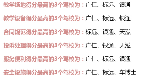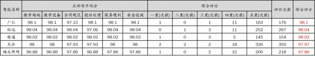 學(xué)員對駕校打分平均分為95.74分(滿分100分),與第三季度95.71分基本持平。其中,綜合評分最高的前5名駕校分別為:廣仁、標(biāo)遠(yuǎn)、銀通、天泓、福永照明。