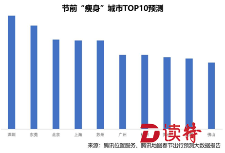 《報告》首次用“瘦身”這一概念來描述某個城市在春節(jié)前期的人員凈流出狀況,也就是用該城市的遷出數(shù)據(jù)減去遷入數(shù)據(jù),從而得出“瘦身”指數(shù)。10大最“瘦身”城市中,深圳、東莞、北京榮膺前三甲,再次成為“空城”;而蘇州超過廣州、杭州,排名第五,令人意外,看來蘇州的吸引力已不亞于北上廣深杭。