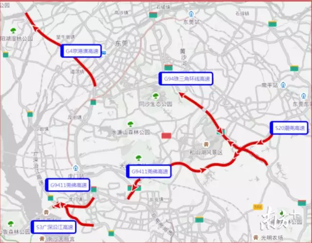 建議途經(jīng)廣深高速公路由深圳往廣州方向(北行)的車輛,在北行長(zhǎng)安出口、虎門(mén)出口繞行國(guó)道或轉(zhuǎn)到?;⒏咚俟返綇V州。