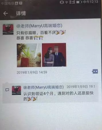 沒(méi)想到半個(gè)月之后,陳先生的朋友發(fā)現(xiàn),他的結(jié)婚照出現(xiàn)在了一個(gè)婚戀公司員工的朋友圈里。陳先生告訴記者,這個(gè)員工轉(zhuǎn)發(fā)他的照片同時(shí)還在上面評(píng)論寫(xiě)上“認(rèn)識(shí)到領(lǐng)證四個(gè)月,遇到對(duì)的人還是挺快的”。