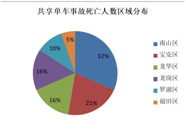 從事故行政區(qū)分布來看,南山區(qū)發(fā)生的共享單車事故死亡人數(shù)最多,死亡6人、占比約為32%,其次為寶安區(qū)、死亡4人、占比21%。