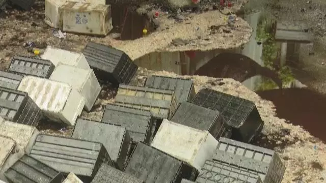 執(zhí)法人員進入時,老板和工人剛逃跑,只剩1名看門男子。而帶有強腐蝕性的電池廢液,無任何處理滿地橫流,現(xiàn)場地表和圍擋的金屬,都已被嚴(yán)重腐蝕。