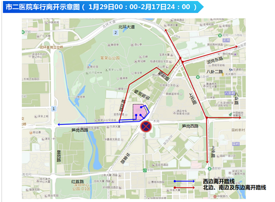 市二醫(yī)院車行離開示意圖--藍(lán)色線條為西邊離開路線,紅色線條為北邊、南邊及東邊離開路線。
