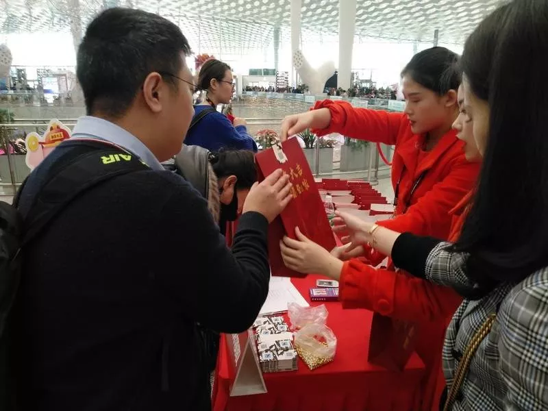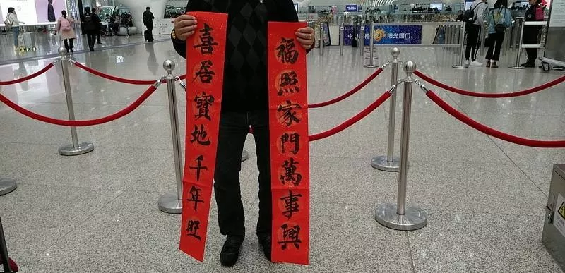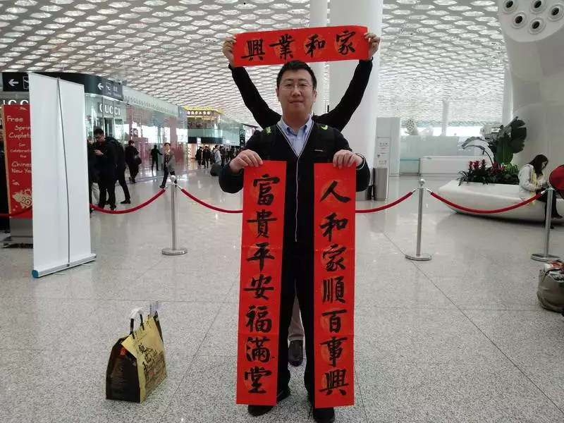 來(lái)領(lǐng)春聯(lián)的旅客里有國(guó)內(nèi)輾轉(zhuǎn)回老家的,有回國(guó)過(guò)年的,也有特地去國(guó)外過(guò)年的。來(lái)自江西婺源的曾老先生11點(diǎn)多的飛機(jī)飛往馬來(lái)西亞,今年他和老伴、孩子將在馬來(lái)西亞過(guò)年。他選的這兩幅春聯(lián)是他對(duì)新年的希望與祝福,將帶到馬來(lái)西亞貼起來(lái),給新年增添年味兒?!拔疫€可以送給朋友,這是最好的禮物,他們一定會(huì)喜歡的。”曾先生高興地說(shuō)。