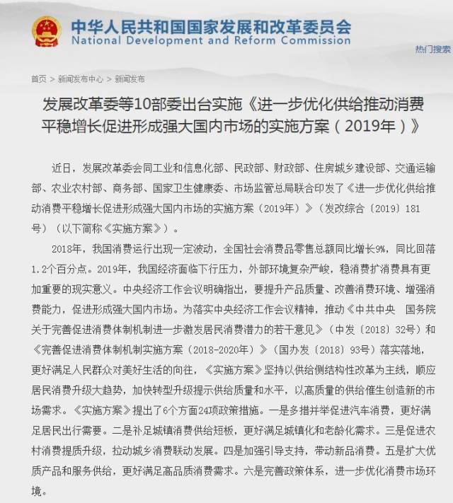 南方+2019年1月30日訊 1月29日,發(fā)改委等部門印發(fā)《進(jìn)一步優(yōu)化供給推動(dòng)消費(fèi)平穩(wěn)增長(zhǎng)促進(jìn)形成強(qiáng)大國(guó)內(nèi)市場(chǎng)的實(shí)施方案 (2019年 ) 》(以下簡(jiǎn)稱《方案》)。