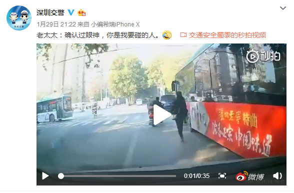 深圳zaker2019年1月31日訊 1月29日,深圳交警微博發(fā)布了一段視頻,并配文"老太太:確認過眼神,你是我要碰的人。"