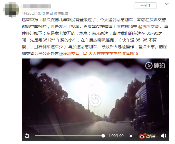 1月26日,有網(wǎng)友在微博爆料稱(chēng)自己的車(chē)在高速上遇到惡意別車(chē),并@深圳交警