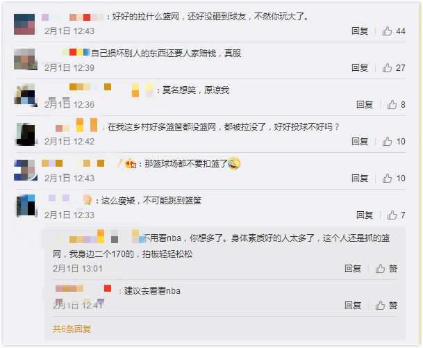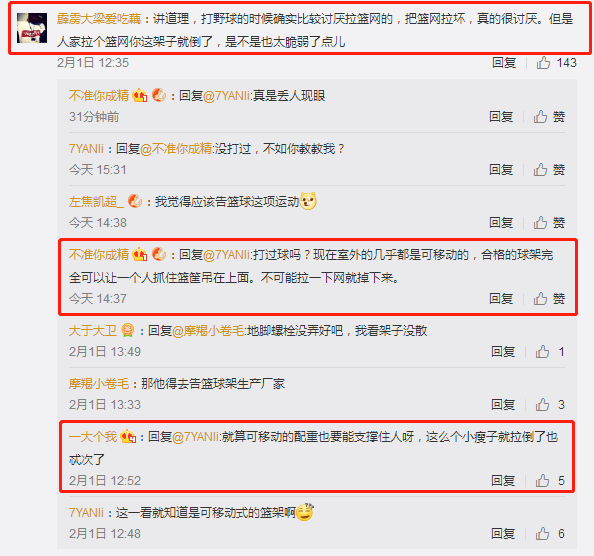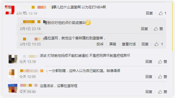 還有一些網(wǎng)友借機表達了自己對某類人的"墻裂"不滿?。]事兒拉什么球框啊,以為在打 NBA?。ⅲ⒒钤?,打球就煩不能扣還裝 X的"......