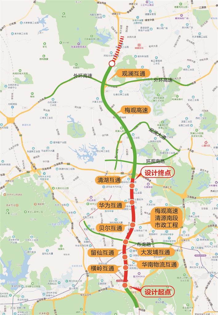 梅觀高速開(kāi)通于1995年,途經(jīng)龍華區(qū)的民治街道、龍華街道和龍崗區(qū)的坂田街道等地,與莞深高速相連接。2014年,該高速路梅林至觀瀾段取消收費(fèi),這是全國(guó)首條運(yùn)營(yíng)期內(nèi)通過(guò)政府回購(gòu)方式取消收費(fèi)的高速公路。由于免費(fèi)后的梅觀高速車(chē)流量急劇增加,交通擁堵日益嚴(yán)重。而且,隨著深圳經(jīng)濟(jì)社會(huì)的發(fā)展、龍華區(qū)的正式掛牌成立,梅觀高速沿線(xiàn)區(qū)域與城市的發(fā)展背景也發(fā)生了較大的變化,作為支撐沿線(xiàn)龍華區(qū)和龍崗坂田片區(qū)兩大功能區(qū)發(fā)展的關(guān)鍵性交通走廊地位愈發(fā)突出,原有的道路不能滿(mǎn)足城市發(fā)展的需要。