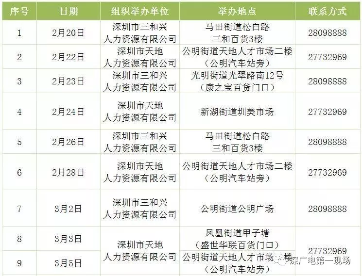 其中,深圳市公共就業(yè)服務(wù)中心26場(chǎng),福田區(qū)27場(chǎng),羅湖區(qū)40場(chǎng),鹽田區(qū)14場(chǎng),南山區(qū)9場(chǎng),寶安區(qū)22場(chǎng),龍崗區(qū)60場(chǎng),龍華區(qū)56場(chǎng),坪山區(qū)18場(chǎng),光明區(qū)25場(chǎng),大鵬新區(qū)9場(chǎng)。