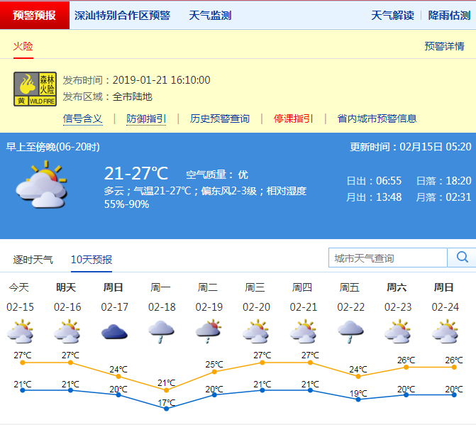 市氣象局預計,15-16日深圳市可見陽光,溫暖濕潤早晚有(輕)霧,氣溫在20-28℃;17-18日天氣轉涼,沿海及高地陣風可達8級;18日有小到中雨;19日小雨轉多云。請市民注意關注低能見度和大風對交通和戶外作業(yè)安全的影響。