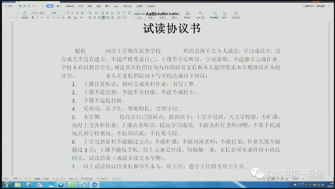 這份《試讀協(xié)議書》的大概內(nèi)容如下:由于某某同學上學期表現(xiàn)不令人滿意,學習成績差,沒有或幾乎沒有進步,不能嚴格要求自己。學生在家長的陪同下與學校達成以下協(xié)議。協(xié)議第六條注明:上學遲到累計不能超過5次;不能曠課;不能頂撞老師;不能打架;作業(yè)欠繳不能超過3次;上課不能玩手機。以上條款是紅線,每觸碰一條,家長必須無條件將小孩接回去,試讀結(jié)束?;蛘咦疃嘧x完本學期。