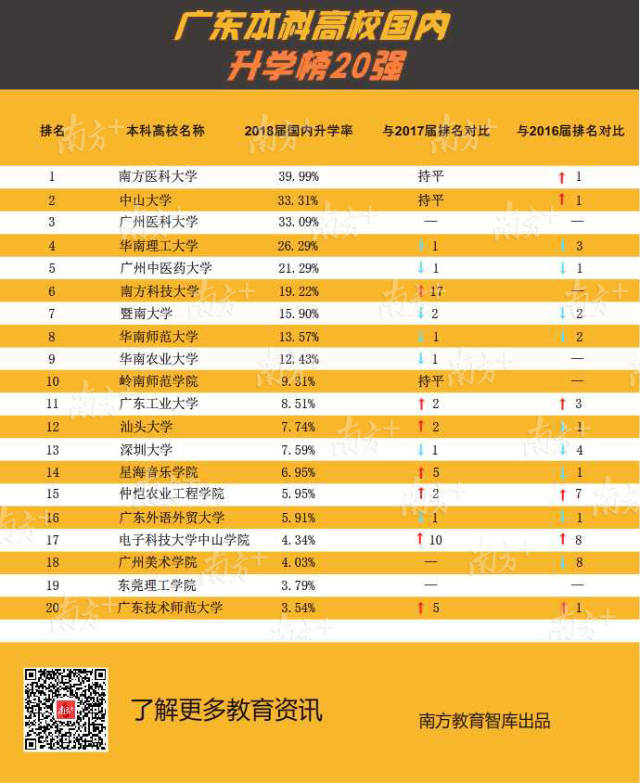 在發(fā)布“薪酬榜”后(點(diǎn)擊查看“薪酬榜”),今天南方教育智庫繼續(xù)獨(dú)家推出廣東高?!吧龑W(xué)榜”,梳理全省123所高校發(fā)布的《2018年畢業(yè)生就業(yè)質(zhì)量年度報告》的關(guān)鍵數(shù)據(jù),聚焦畢業(yè)生的深造路徑和升學(xué)比例。其中南方醫(yī)科大學(xué)、中山大學(xué)、廣州醫(yī)科大學(xué)本科畢業(yè)生國內(nèi)升學(xué)率位列前3名,均超過33%。
