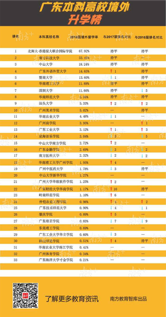 廣東外語外貿(mào)大學(xué)境外留學(xué)人數(shù)顯著提升,2018屆共有275人升入世界排名前100名的高校深造。兩所內(nèi)地與香港合作創(chuàng)辦的大學(xué)在境外留學(xué)率上處于全省前列。北京師范大學(xué)-香港浸會(huì)大學(xué)聯(lián)合國(guó)際學(xué)院持續(xù)多年保持全省第1位,此次共有811人留學(xué),其中481人就讀世界前100名的大學(xué)。香港中文大學(xué)(深圳)僅公布總升學(xué)率65.67%,該校就業(yè)處相關(guān)負(fù)責(zé)人介紹,升學(xué)率中絕大部分是境外留學(xué),176名學(xué)生平均每人收到3份世界知名大學(xué)錄取通知書。