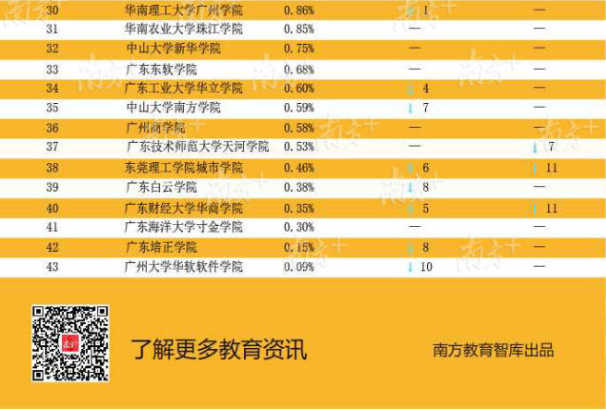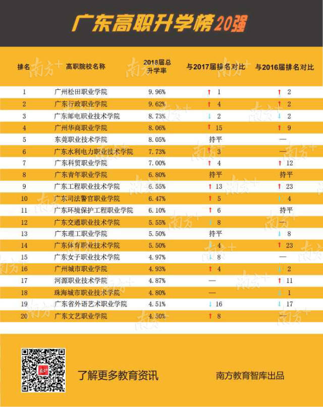 近3年各高職升學(xué)數(shù)據(jù)顯示,越來越多畢業(yè)生通過升學(xué)提升自身競爭力,尤其2018屆升學(xué)率增長明顯。其中有7所高職院校的畢業(yè)生升學(xué)率達(dá)到或超過7%,分別是廣州松田職業(yè)學(xué)院9.96%、廣東行政職業(yè)學(xué)院9.62%、廣東郵電職業(yè)技術(shù)學(xué)院8.73%、廣州華商職業(yè)學(xué)院8.06%、東莞職業(yè)技術(shù)學(xué)院8.05%、廣東水利電力職業(yè)技術(shù)學(xué)院7.73%和廣東科貿(mào)職業(yè)學(xué)院7.00%。