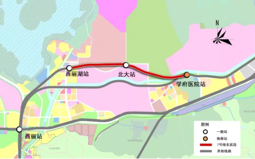 7號線東延起于既有7號線西麗湖站后,終點站為學(xué)府醫(yī)院站。線路總長約2.2公里,采用地下敷設(shè)。